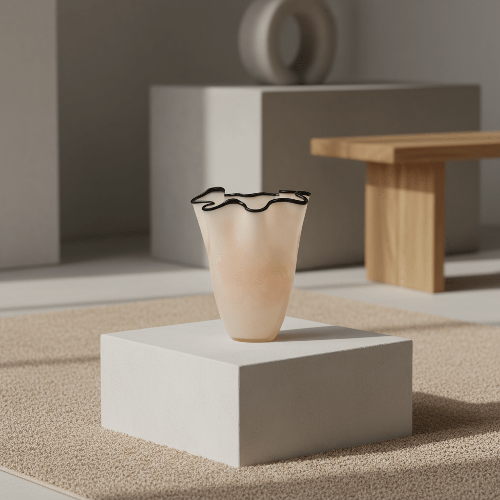 The Jarvis Glass Vase in ivory and black combines sculptural form with a delicate hand-finished edge. Its fluid silhouette, finished with a striking black ruffled rim, brings movement and artistry to any surface.