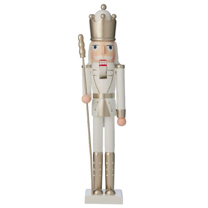 A timeless symbol of Christmas tradition — reimagined with refined elegance. The Wooden Nutcracker Soldier stands tall in a pearl-white uniform accented with brushed antique gold, offering a sophisticated and contemporary take on a beloved classic.